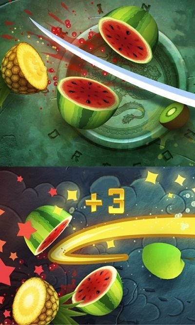 1、游戏效果做的比水果忍者更精致细腻,玩家切开水果的感觉比玩水果忍者更爽快