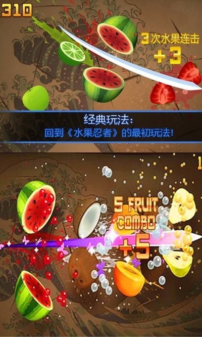 3、玩家需要切开菜单中的水果才能进入相应的选项,包含经典模式和时间模式两种玩法