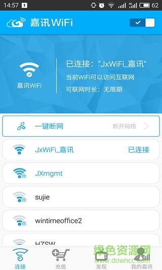 嘉讯Wi-Fi ios版是一款非常实用的WiFi管理软件,通过这款软件轻松管理WiFi链接情况,这款软件还有宽带充值、影视视频观看等功能哟,需要的朋友快快来绿色资源网下载体验吧!