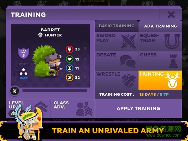王国联盟是一款模拟战争策略游戏“战国同盟”的续作。在经过数月的战斗,一个名为温特尼的战士终于脱颖而出,登上了王位,他治国有方,使Kurestal王国走上了和谐发展的道路。可在一个风雨交加的夜晚,他遭遇了暗杀,很快黑暗武士克莱格夺取了政权,并诏告天下,重选近卫武士团。在游戏中,玩家可从乡村、森林、山区和城市这四个地方招募战士、武士、箭手、魔法师等兵种,将其纳入自己的军队里。利用空闲的时间训练他们的武力、生命力、智力以及敏捷度,提升他们的等级,让他们参加各种各样的的战役,完成各项冒险任务。当自己的士兵提升到Lv5或者Lv10等级,玩家可根据自己的喜好,让士兵转职,其他等级,例如Lv6,则不可以进行转职。点击进入某一个Lv5或者Lv10的士兵,点击“CLASS ADV.”进入转职界面,选择右侧其中一种职业,便可成功转职。