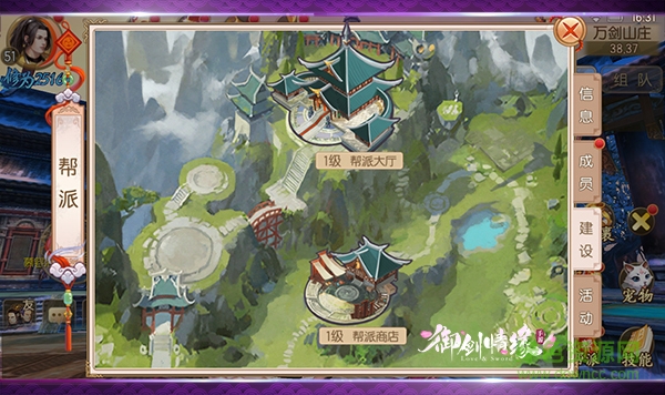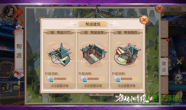 建立帮派后,可消耗一定的帮派资金对帮派大厅、帮派金库及帮派商店进行建设升级。