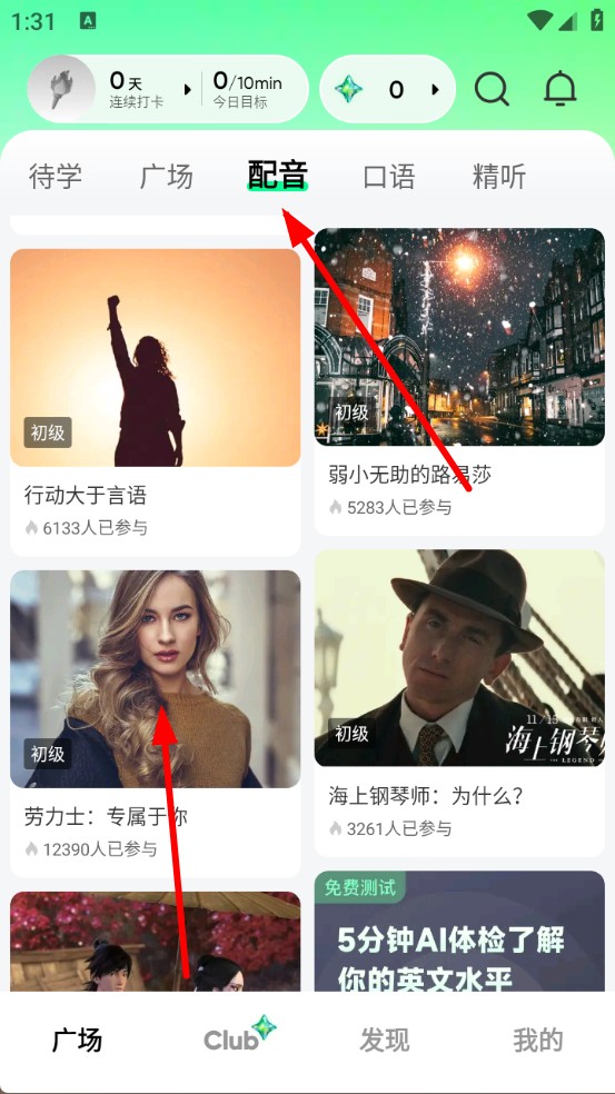2、在广场页面点击配音标签,挑选行动大于言语、劳力士:专属于你等感兴趣的素材,进行英语配音。