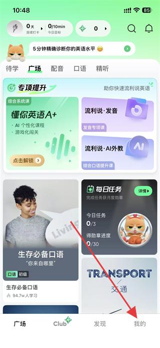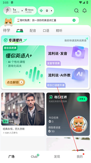 1、打开流利说英语app,点击底部导航栏的我的选项。