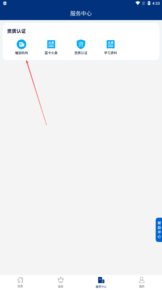 2、在服务中心页面,找到资质认证板块,点击增加机构按钮。