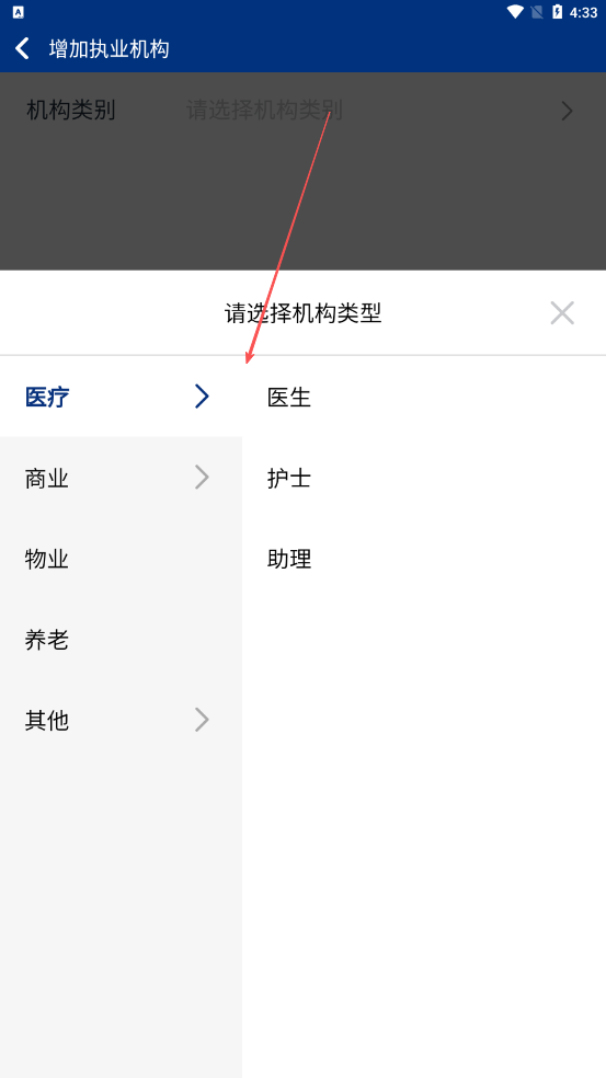 3、进入增加执业机构页面后,点击机构类别选项,在弹出的列表中选择对应的机构类型。