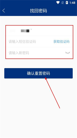 4、获取并输入验证码,设置新密码后点击确认重置密码,完成密码修改。