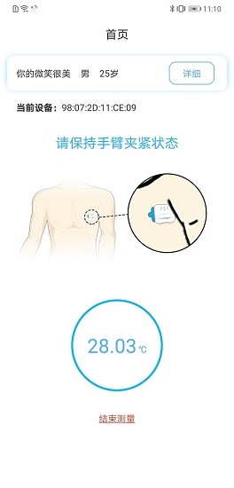 通过蓝牙连接,24小时连续监测用户体温,实时感知体温变化;