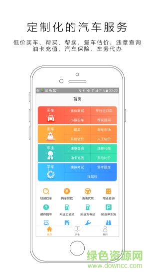 从看车、选车、买车、用车、卖车,覆盖用户的整个汽车生命周期,为各个阶段的用户提供量身打造的服务。包括:低价买车、帮买、帮卖、爱车估价、违章查询、油卡充值、汽车保险、车务代办等。