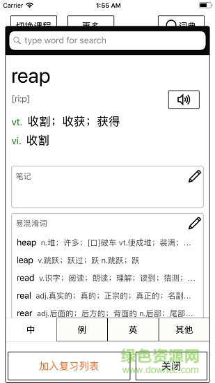 创新学习方法,简单高效。还可作为词典使用,中英双解,便捷记笔记,可将任意生词添加到单词复习表中,助力阅读学习,及时背诵英语阅读障碍单词。四种学习模式,速记、拼写、例句、联想模式,强化有效重复、拼写发音、理解词义、使用英语思维等词汇学习必要的学习过程。