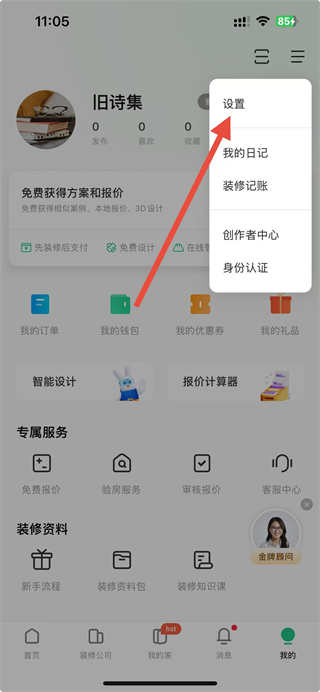 1、打开土巴兔APP,点击底部导航栏的我的选项,在个人页面右上角,点击菜单图标。