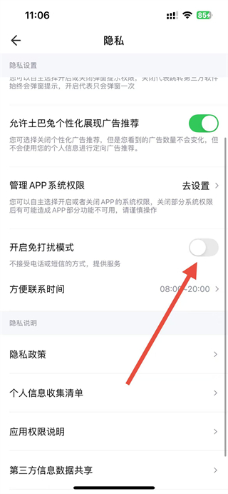 4、在隐私界面中,找到开启免打扰模式对应的开关按钮,点击该开关即可开启免打扰模式。