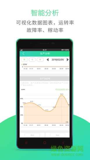 智能分析:可视化数据图表,运转率、故障率、稼动率等;