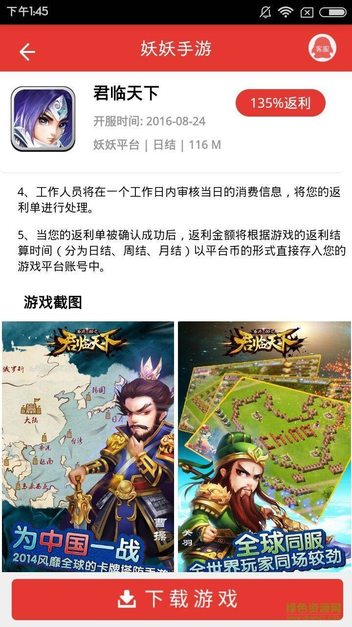 妖妖手游客户端是一款由湖南聚漫文化有限公司专为安卓用户打造的手机游戏充值返利平台,通过该应用不可以下载热门手游,还可以返利哟,非常的不错,需要的朋友赶紧来绿色资源网下载吧