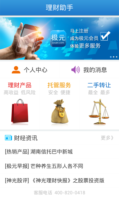 1.轻松管理理财产品:极元理财助手可以管理你的已投资产品,可以托管各类理财产品,可以集中查看产品的运营情况,理财产品到期时,还会提供及时准确的提醒服务,还可以通过二手市场转让产品。