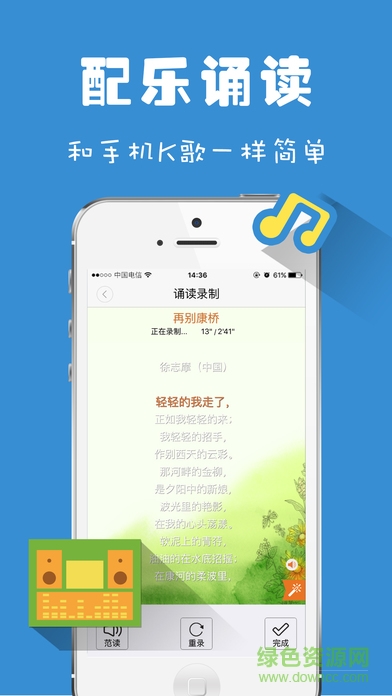全球独创、最火爆的随身配乐诵读录音软件!能让用户们轻松、快乐赚钱的配乐诵读社区!欢迎你来这里,诵好诗,读美文,诵读一切美好的事物!你喜欢的诗歌自己读!你自己的诗歌自己读!