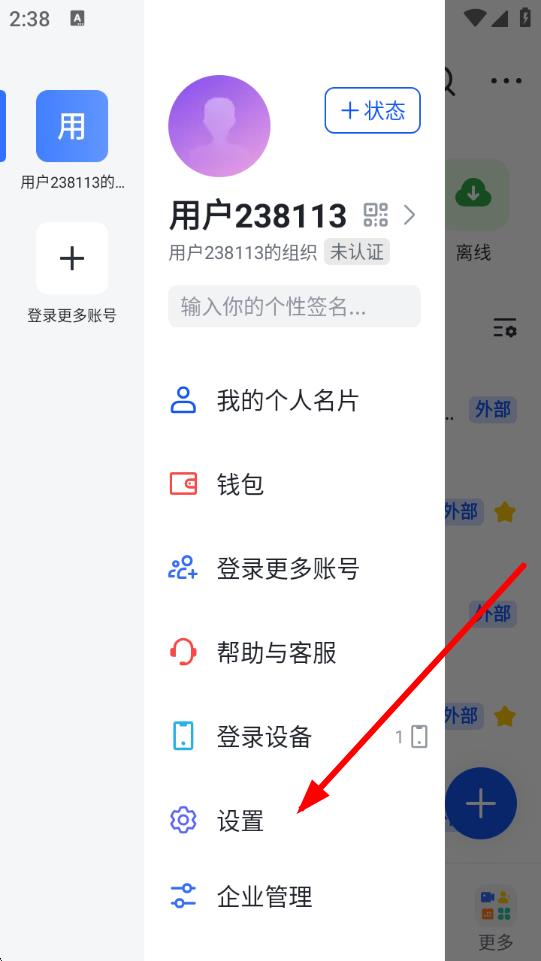 1、打开飞书点击左上角头像,在弹出菜单中点击设置选项。