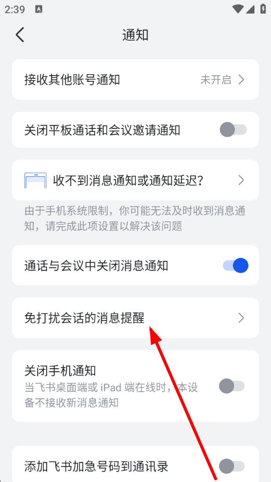 3、在通知页面中,找到合适选项如免打扰会话的消息提醒进行设置以实现静音效果。