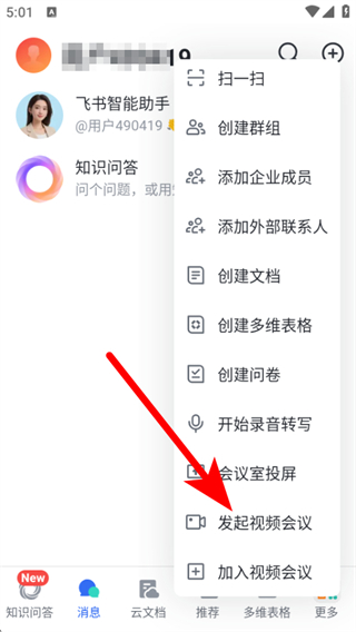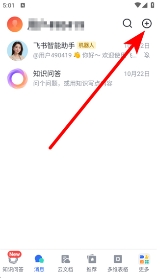 1、打开飞书APP,需要点击右上角的+图标,展开功能的菜单。