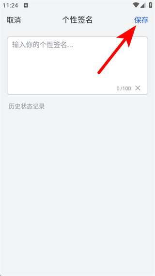4、在编辑页面输入个性签名后,点击保存完成个性签名设置。