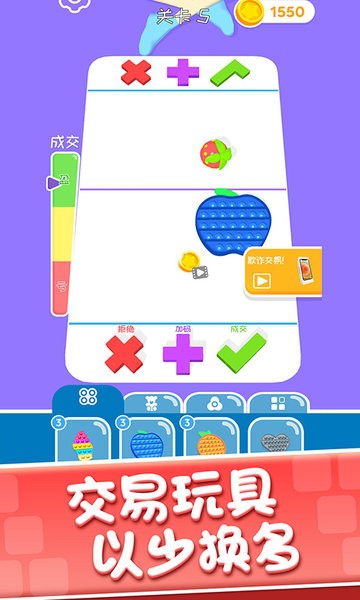 通过和对手交换玩具来达成交易,讲究的是以少换多、讨价还价。