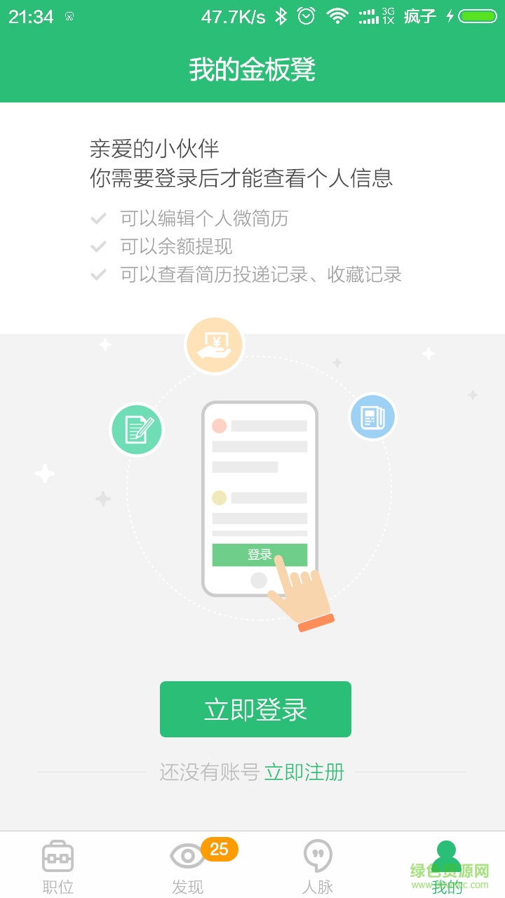 在金板凳寻找工作的过程当中,可在悬赏板块进行自荐与圈内推荐,边找工作边赚取悬赏金。金板凳的“人脉 ”功能,建立自己的职场人脉圈,可以聊工作、谈商务、找妹子、找基友。提供更高效快捷的求职通道,满足大众化的招聘需求。还在到处找工作而苦恼吗?还在到处找自己理想的工作而奔波吗?赶紧在绿色资源网下载金板凳app,提供更高效快捷的求职通道,满足大众化的招聘需求。