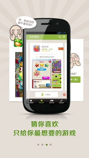 依托人工智能算法,根据您的喜好,精心为您量身挑选你喜欢的游戏,我们知道你喜欢什么。如果不喜欢我们的推荐,也可以一键删除。