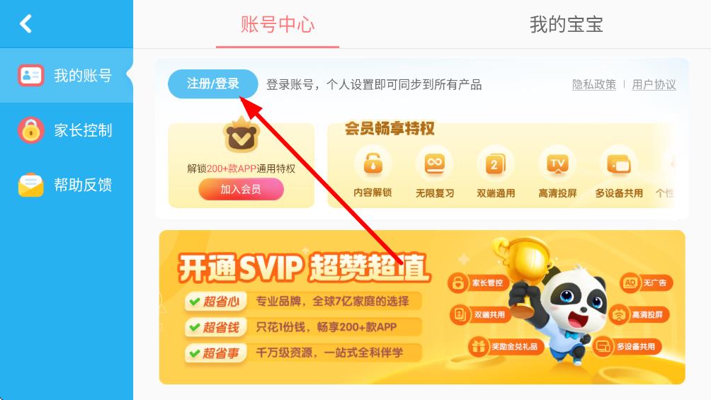 3、进入账号中心页面后,点击注册登录按钮,进入注册操作。