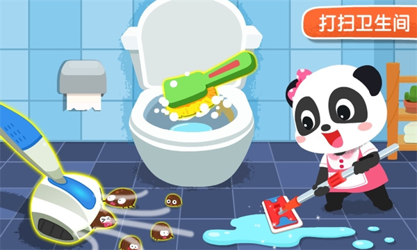 卫生间里好脏,快来打扫一下!清理讨厌的小虫子,再给马桶喷上清洁剂和杀菌药水,刷完一按冲水建——咦,水下不去?原来是水管坏了,宝宝快来接好它!(锻炼宝宝逻辑思维能力)