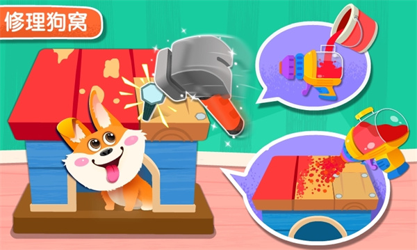 小狗的房子坏了,快帮他修好房顶,再刷上漂亮的油漆,小狗看见好开心;清理破掉的墙纸,挑一张粉红墙纸贴上,家里变得好温馨!(激发宝宝创造力。)