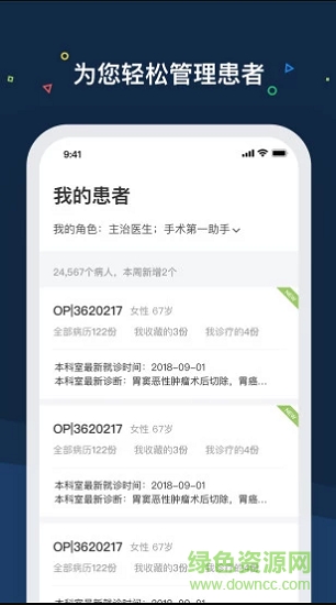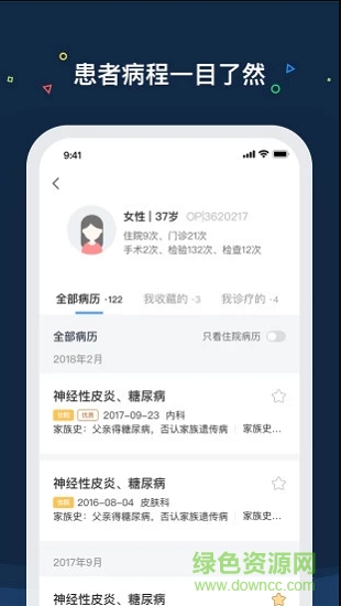 专为医生打造的一款辅助工具,app中自带海量病历,可以快速的搜索,帮助医生轻松的管理患者信息,还有病程信息一目了然,很好用的医生看病助手。