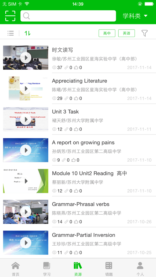 2.资源中心:按资源类型可以分视频、文档、测验、题库;筛选条件可以按学段、学科、年级,共享级别;选择学科之后可以按章节和知识点过滤查询;同时还可以模糊查询。视频资源还可以按学科类和特色类查询。