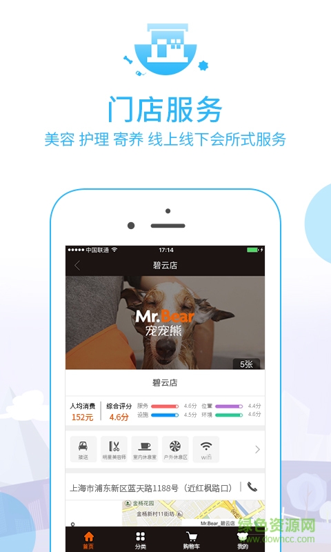 4、门店预约:涵盖宠物美容护理、宠物寄养在线预约服务,一键查找线下门店所有信息,让您足不出户,即可找到全国各地所有的宠物门店,更有惊喜折扣等着你。
