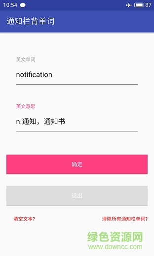 通知栏背单词app是单词背记工具,想要学好英语,单词背记是必须的。该软件将单词显示在通知栏上,方便背记,界面清新简单,深受广大用户的喜欢,利用琐碎的时间学好英语,非它不可!有兴趣的用户欢迎来绿色资源网下载!