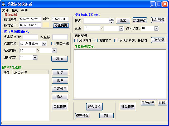 首先选择好点击类型,并设置模拟一个动作的延迟时间,然后把鼠标对准要点击的地方,按F8快捷键捕捉鼠标坐标并生成模拟动作添加进鼠标事件流程框。这时一个鼠标模拟动作就添加完成了,再设置好循环次数后点鼠标模拟按钮就可模拟点击刚才捕捉到的坐标位置。鼠标坐标有两种坐标,一个是以屏幕左上角为0点的坐标,另一个是以本软件窗口左上角为0点的坐标。使用窗口坐标的好处是,操作窗口位置可以改变,改变后本软件的相对位置也改变下就行了。窗口坐标的使用方法是:把“用相对本窗口坐标”选择框选中,然后把本软件的右边(其他边也行,下同)与要操作的窗口左边相贴,顶边平行,再按F8快捷键捕捉坐标,此时捕捉到的坐标就为窗口坐标。这时把要操作的窗口位置改变,本软件窗口位置也相应改变,只要本软件窗口的右边与操作窗口的左边一直相贴,顶边平行,原来捕捉到的坐标在屏幕分辨率不变的情况下就可以一直使用。