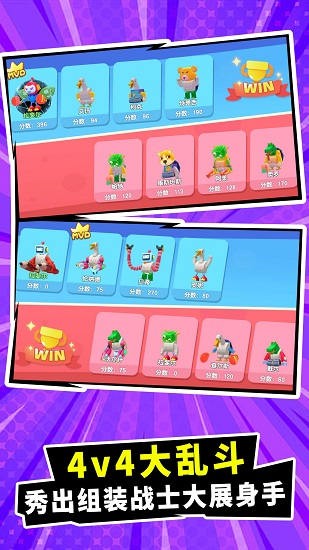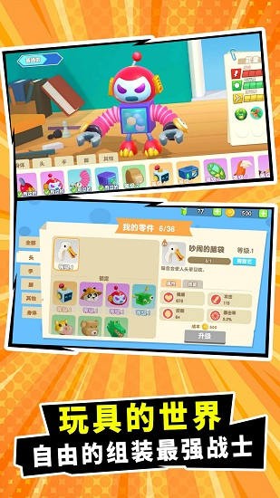 休闲的竞技类游戏,组装你的玩具部件,合成最强战斗家,在玩具的世界中闯关完成任务获取金币,亦或来一场紧张刺激的4V4大乱斗!