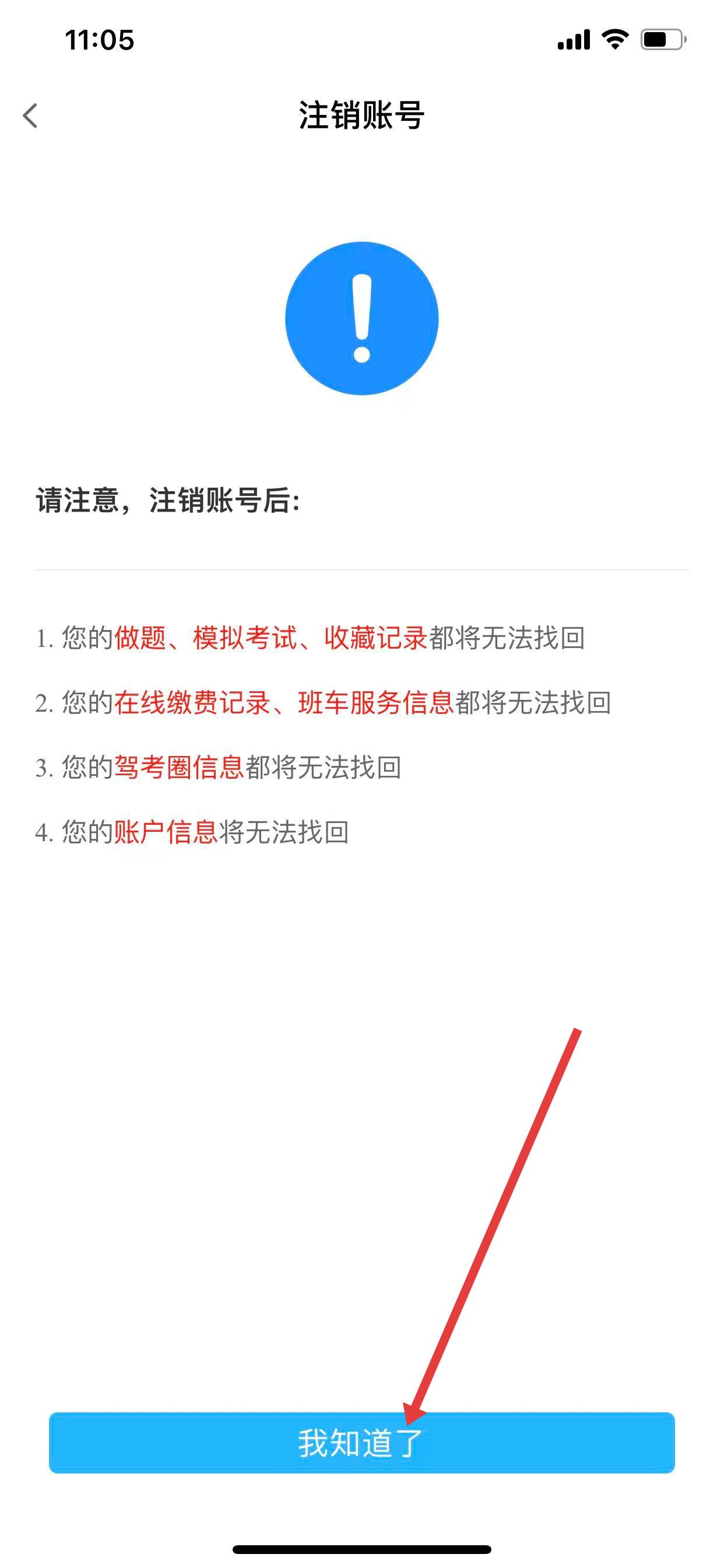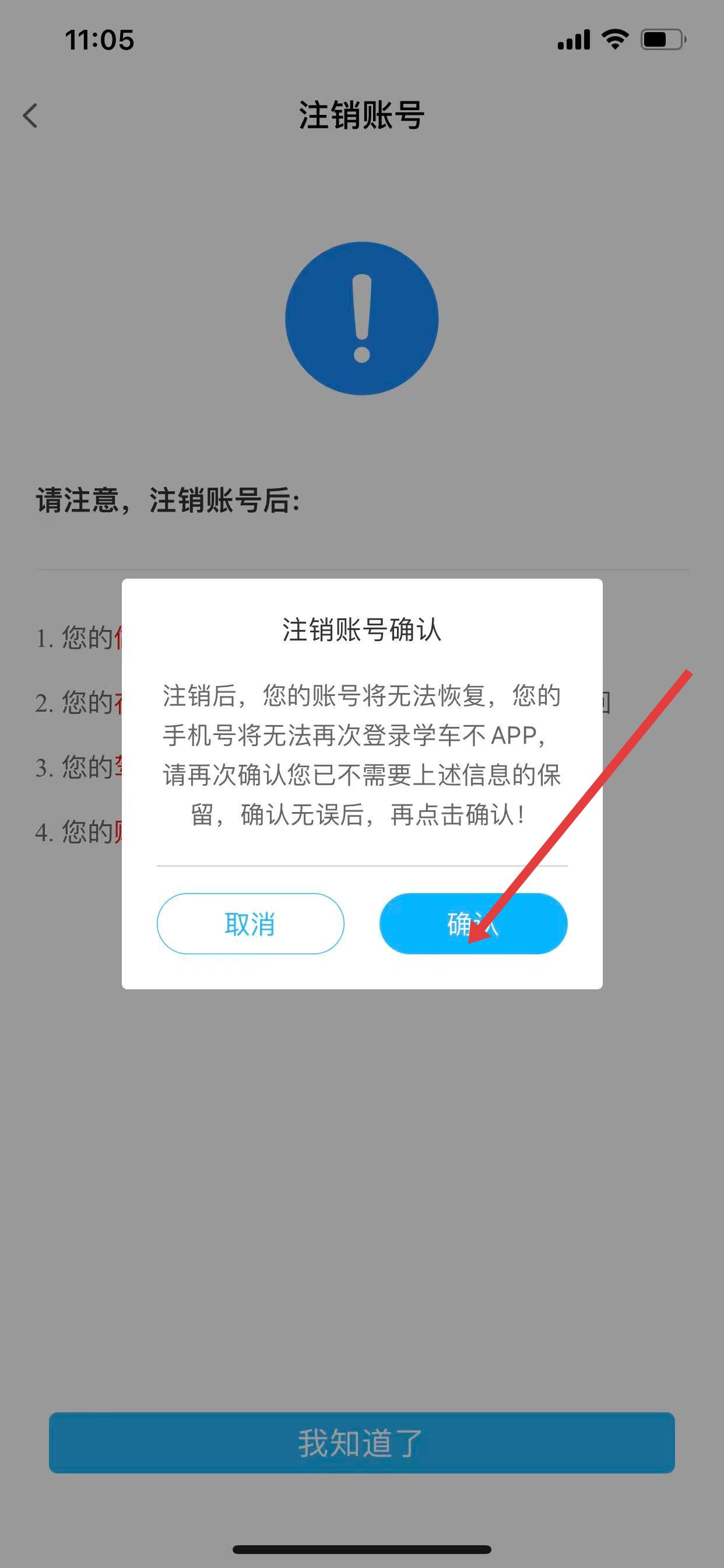 4、在弹出的注销账号提示页面,阅读相关提示信息后,点击我知道了。