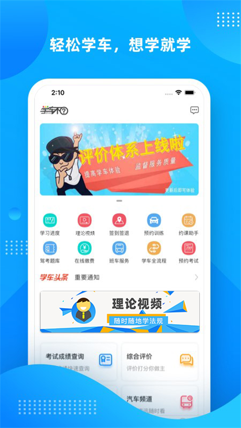 学车不学员版推出的“在线约车”,实时更新各大驾校可预约车辆,抢约快人一步!一系列在线学车功能,帮助驾考学员实现线上学习、模拟、预约,让校内练车、考试更效率,快捷提速事半功倍。