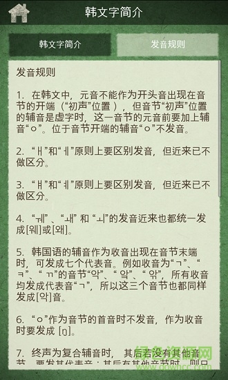 易学韩语软件是一款非常好用的手机学韩语app,有详细的韩文字介绍和发音规则,适合没有任何韩语基础的人来使用,欢迎喜爱的朋友到绿色资源网下载使用!