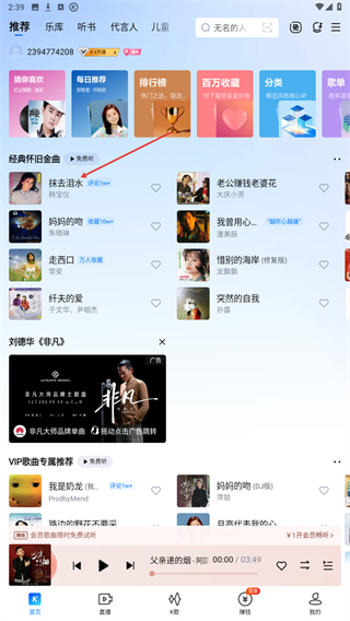 2、进入录歌的页面内,在推荐下选择并点击要k歌的歌曲。
