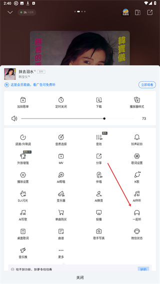 3、在弹出的功能菜单里,找到一起听歌的选项并点击即可成功与好友一起听。