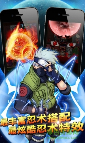 1、游戏以日本人气动漫《火影忍者》为故背景,游戏中引入多种忍者角色。