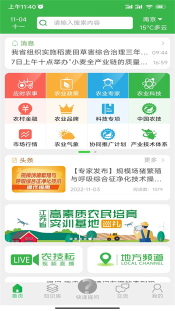 开设“应时农业”、“农业科技”、“农业视频”、“创业致富”等专题栏目,开发“提问”、“交流”、“知识库”等实用功能,用户可方便快捷地浏览最新的农技资讯,还可与其他用户开展互动交流,与专家进行一对一咨询,提供“全天候、顾问式”的线上技术服务。