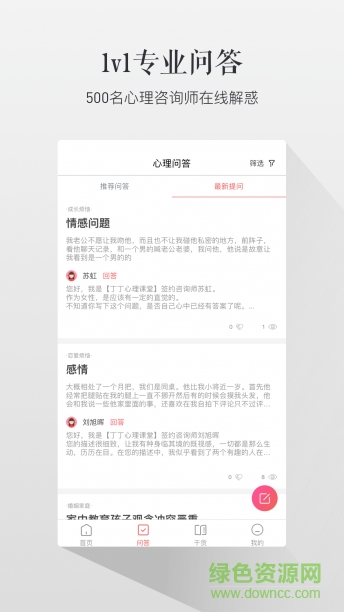 丁丁心理app是一款专业的心理咨询平台,这里汇聚了众多权威的心理咨询师,提供一对一的情感资讯服务,在线预约老师解决用户各种情感问题,还提供心理测试、心灵专题等栏目,欢迎来绿色资源网下载!