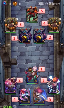 首先,《驱魔少年》的战斗采用的是不可操作的回合制战斗模式,战斗每一方由最多5名主力成员及包含助战英雄在内的共4名替补成员组成。进入战斗后,攻守双方按阵型1~5号位的顺序轮流出手,如下图所示,出手顺序为:己方1号→敌方1号→己方2号…以此类推,当某位置空缺时,则跳过由另一方英雄继续出手。战斗中英雄死亡后,下一回合开始替补英雄即出场代替死亡英雄的位置,当一方的角色全部死亡后,则另一方获胜。