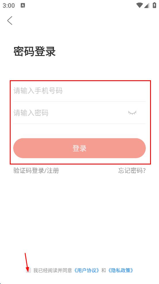 4、进入密码登录页面,勾选我已经阅读并同意用户协议和隐私政策,输入手机号码和密码,点击登录。