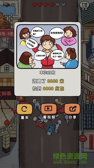 春节自救指南是一款以春节为主要题材的跑酷类游戏,春节到了,七大姑八大姨是不是又在灵魂深处拷问你,学习成绩怎么样啊,有没有交到女朋友啊,在哪里工作一个月可以拿多少钱啊,是不是有种想要逃跑的感觉,感兴趣的朋友就来绿色资源网下载安装吧