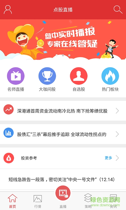 点股直播是一款关于财经的新闻资讯软件,通过点股直播您能够及时了解到行情变化,得到行情信息指导,从而不错过挣钱的好机会。点股直播是很多股民的首选app,您还在等什么,快来绿色资源网下载啊。