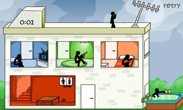3、在拿错钥匙的火柴人进房间的时候迅速点击中间房间的火柴人,他自杀时连正好开门的火柴人一起杀死。音乐把右边房间的火柴人吵醒,等他探头看的时候点击窗户,会被窗户夹掉脑袋而死,泳池的人突然看到一个脑袋会吓的跳出泳池摔死。
