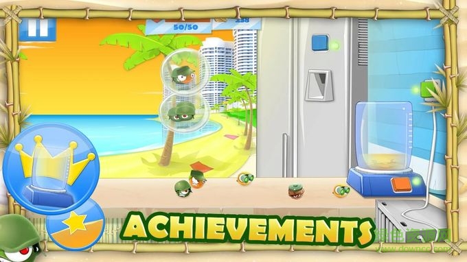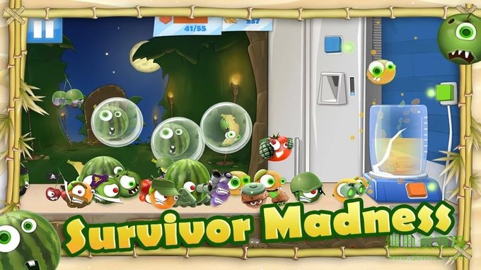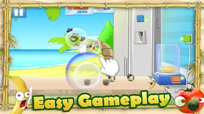 水果组成的大军向榨汁机发起进攻,从苹果到香蕉到西瓜,每种不同的水果都有自己独特的进攻方式。你要点击橙色按钮操作榨汁机、蓝色按钮操作冰块制造机、绿色按钮操作风扇等来对它们进行防御,并且用手指在屏幕上画圈将水果困在气泡中,然后抓起来送入榨汁机。你要消灭所有的水果才能进入下一关卡,你所获得的金币还能升级自己的能力。快来比比看你和水果谁厉害吧。