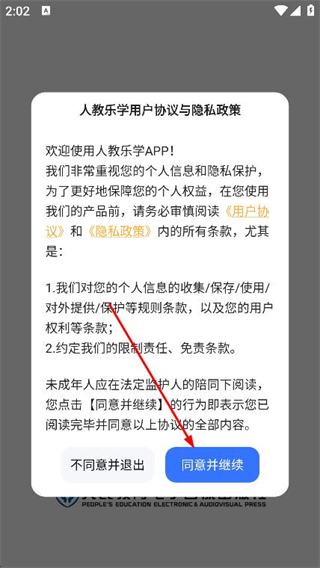 1、打开人教乐学,在弹出的页面,点击同意并继续按钮。